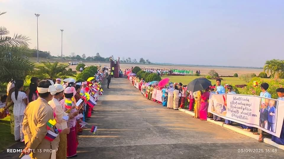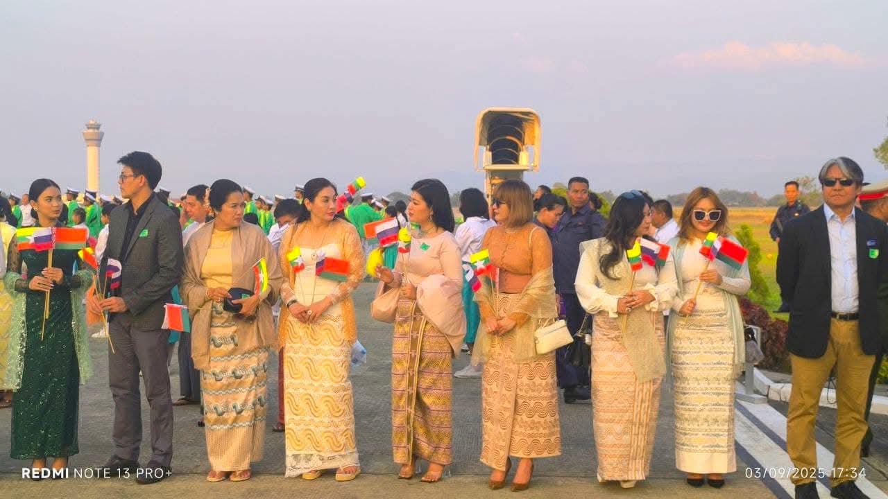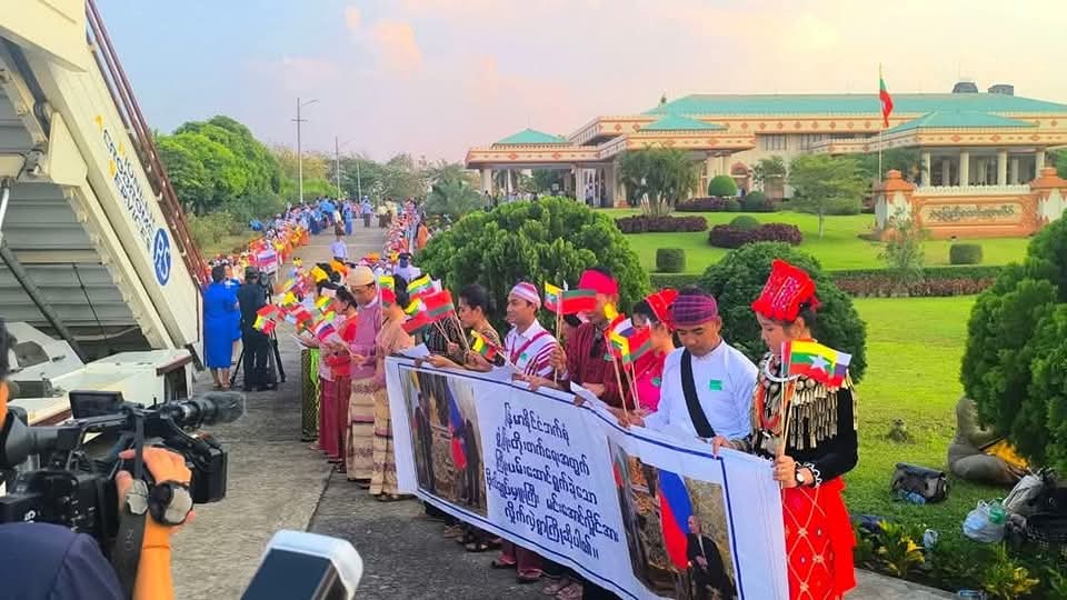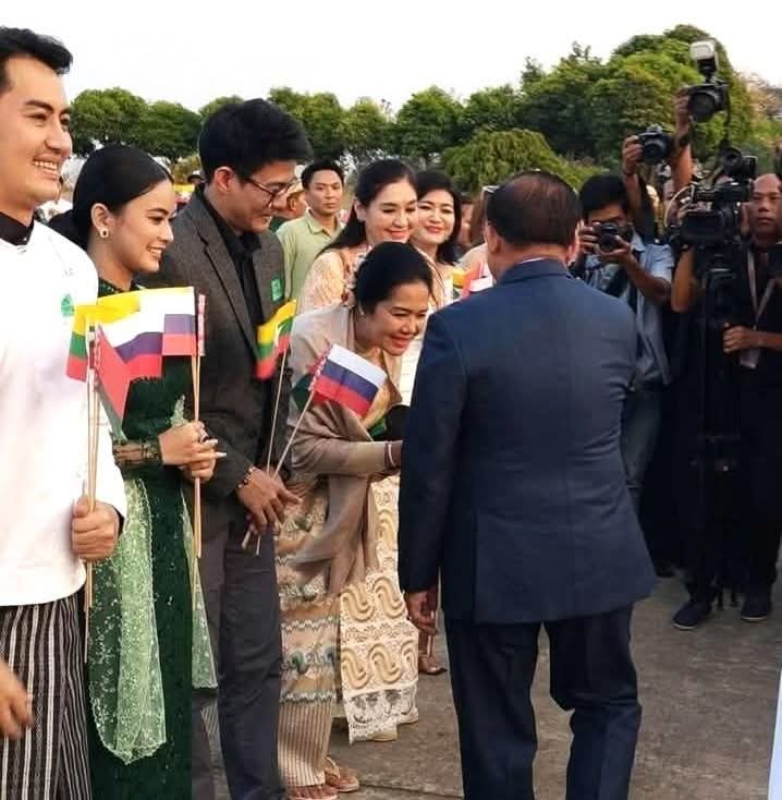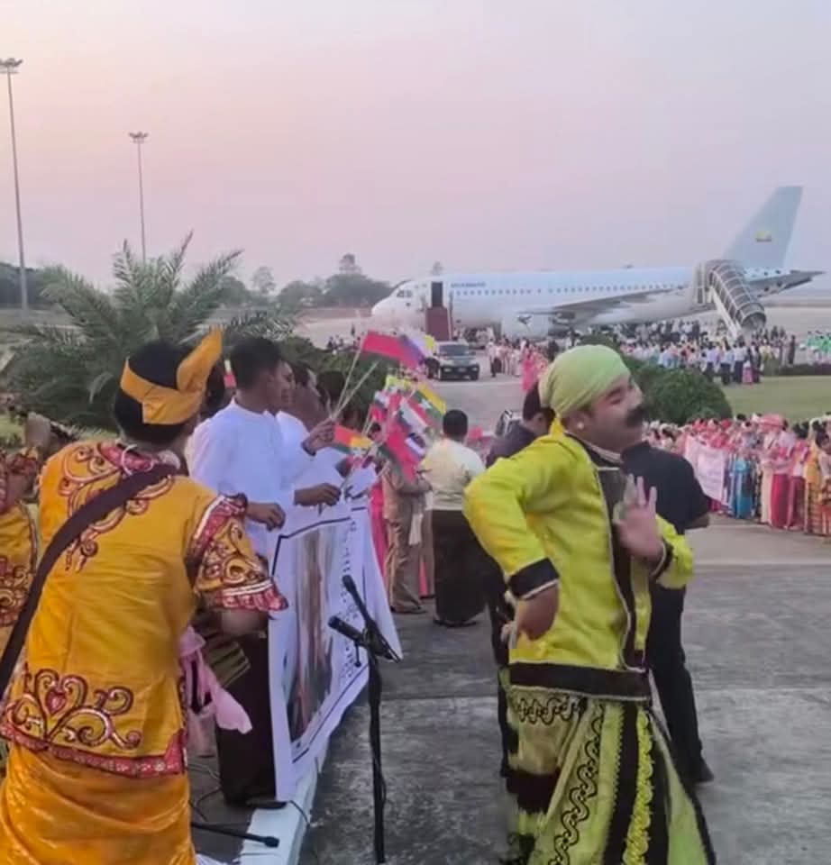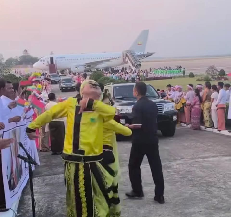 စစ်ခေါင်းဆောင် လေယာဉ်ပေါ်မှ ဆင်းလာချိန်တွင် အနုပညာရှင်များနှင့် စစ်ကောင်စီထောက်ခံသူများ၊ စစ်တပ်လော်ဘီ ဝါဒဖြန့်သူများက ဦးခေါင်းကို ကုန်းညွှတ်၍ အလေးပြုကြိုဆိုနေကြသည့်ပုံများလည်း ထွက်ပေါ်လာသည်။
