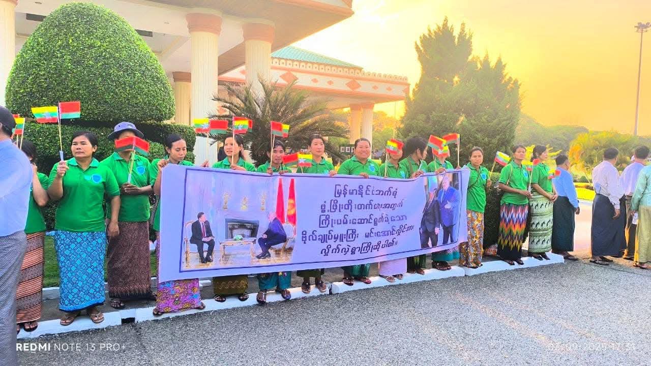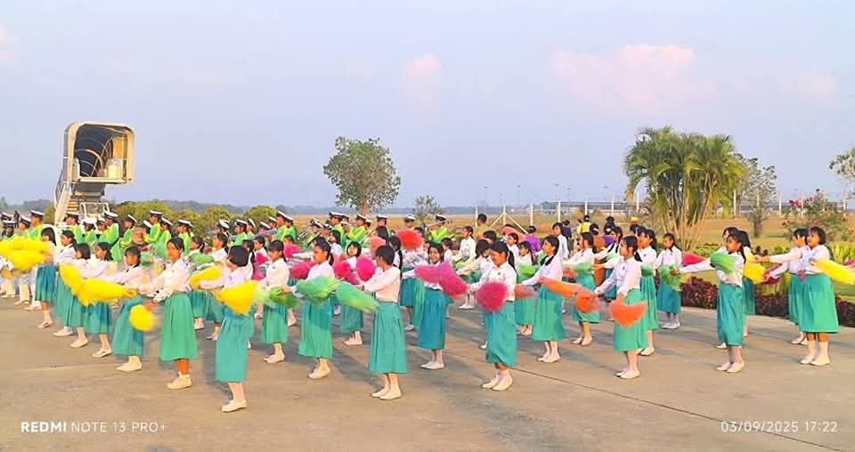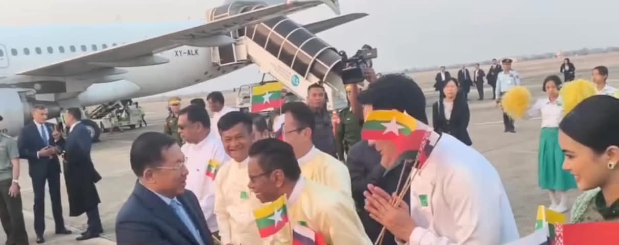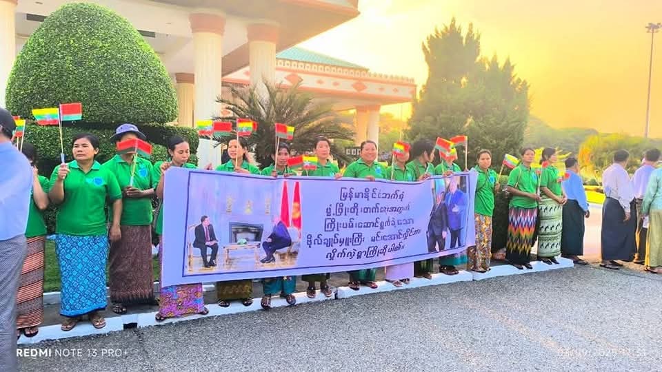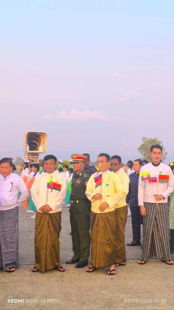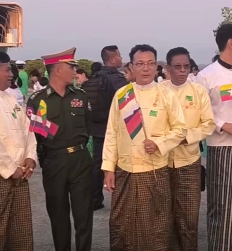 စစ်ခေါင်းဆောင် လေယာဉ်ပေါ်မှ ဆင်းလာချိန်တွင် အနုပညာရှင်များနှင့် စစ်ကောင်စီထောက်ခံသူများ၊ စစ်တပ်လော်ဘီ ဝါဒဖြန့်သူများက ဦးခေါင်းကို ကုန်းညွှတ်၍ အလေးပြုကြိုဆိုနေကြသည့်ပုံများလည်း ထွက်ပေါ်လာသည်။