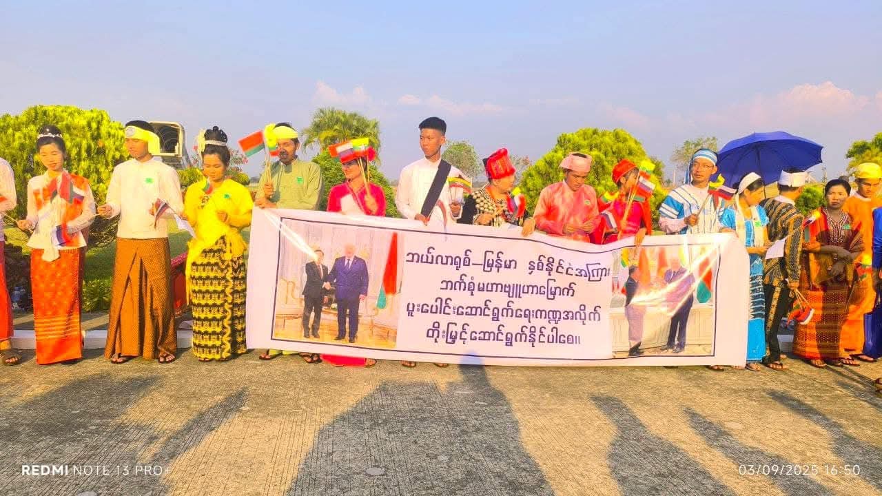 ပုံစာ-စစ်ခေါင်းဆောင်ဗိုလ်ချုပ်မှူးကြီးမင်းအောင်လှိုင်အား လာရောက်ကြိုဆိုကြရသူများကို တွေ့ရစဉ်