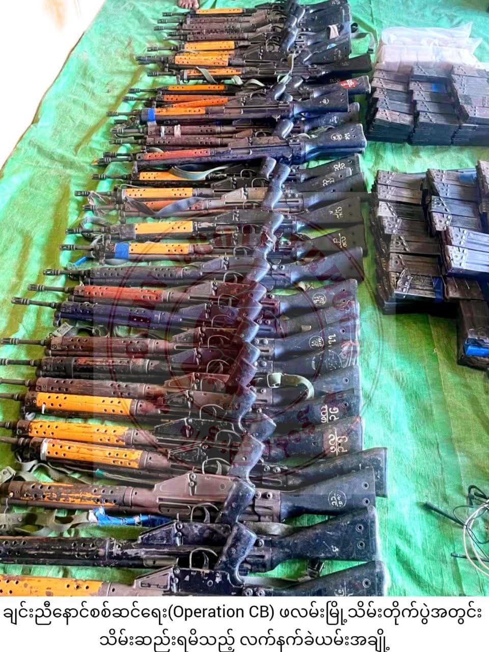 ဖလမ်းမြို့သိမ်းတိုက်ပွဲအတွင်း သိမ်းပိုက်ရရှိတဲ့ လက်နက်ခဲယမ်းနဲ့ စစ်အုပ်စု စခန်း/Photo – CB, CJ
