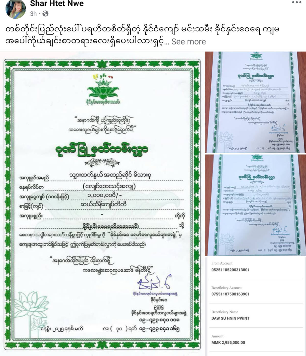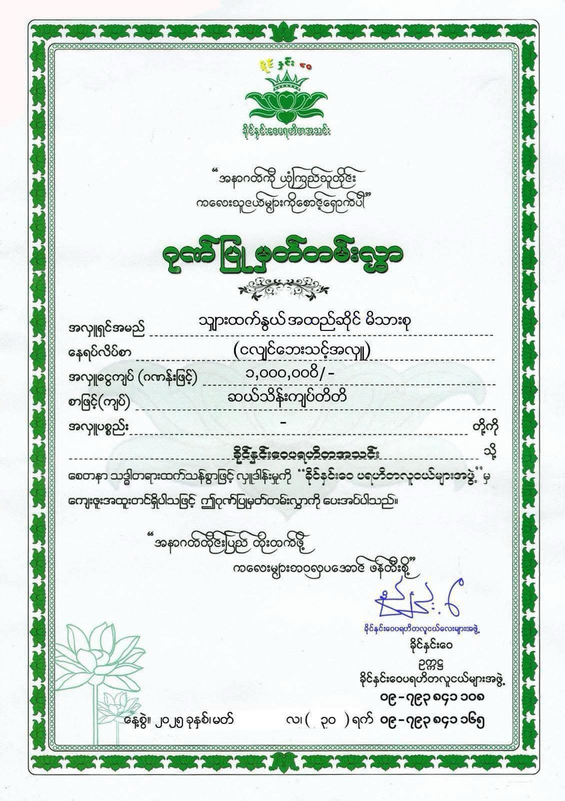 လှူလိုက်ပြီလို့ ပြောတဲ့အပြင် ဒီပိုက်ဆံလိုချင်ရင် သူတို့က နေပြည်တော်ကိုအဆင့်ဆင့်တင်ပေးရဦးမယ်လည်းပြောပါသေးတယ်။ပိုက်ဆံ သိန်း၃၀က ဒီလောက်အဆင့်ဆင့် လုပ်ရမယ်လို့မသိခဲ့တာပါ။ ငွေဝင်တုန်းကတော့ ဘယ်သူ့ဆီက ဝင်လာမှန်း မစစ်ဆေးဘဲ ပြန်ထွက်ခါမှ နေပြည်တော်ထိ စရင်းတင်ရတယ်လို့ သိရပါတယ်။နေပြည်တော်ထိ တင် တာကိုကျမတို့က ဘယ်ချိန်ထိ စောင့်ရနိုင်လဲမေးတာကို အချိန်အတိအကျ မသိဘူး။သူတို့ကိုပဲ ယုံကြည်ပြီးစောင့်ရမယ်လို့ ပြောလာပါတယ်။ ကျမတို့က ဒီလို စကားတွေရှေ့နောက်မညီ မျိုးစုံဖြစ်လာတော့ ဘယ်လိုယုံရမလဲမေးတဲ့အခါ မယုံရင်တရားဥပဒေ အတိုင်းလုပ်လို့ပြောပါတယ်။