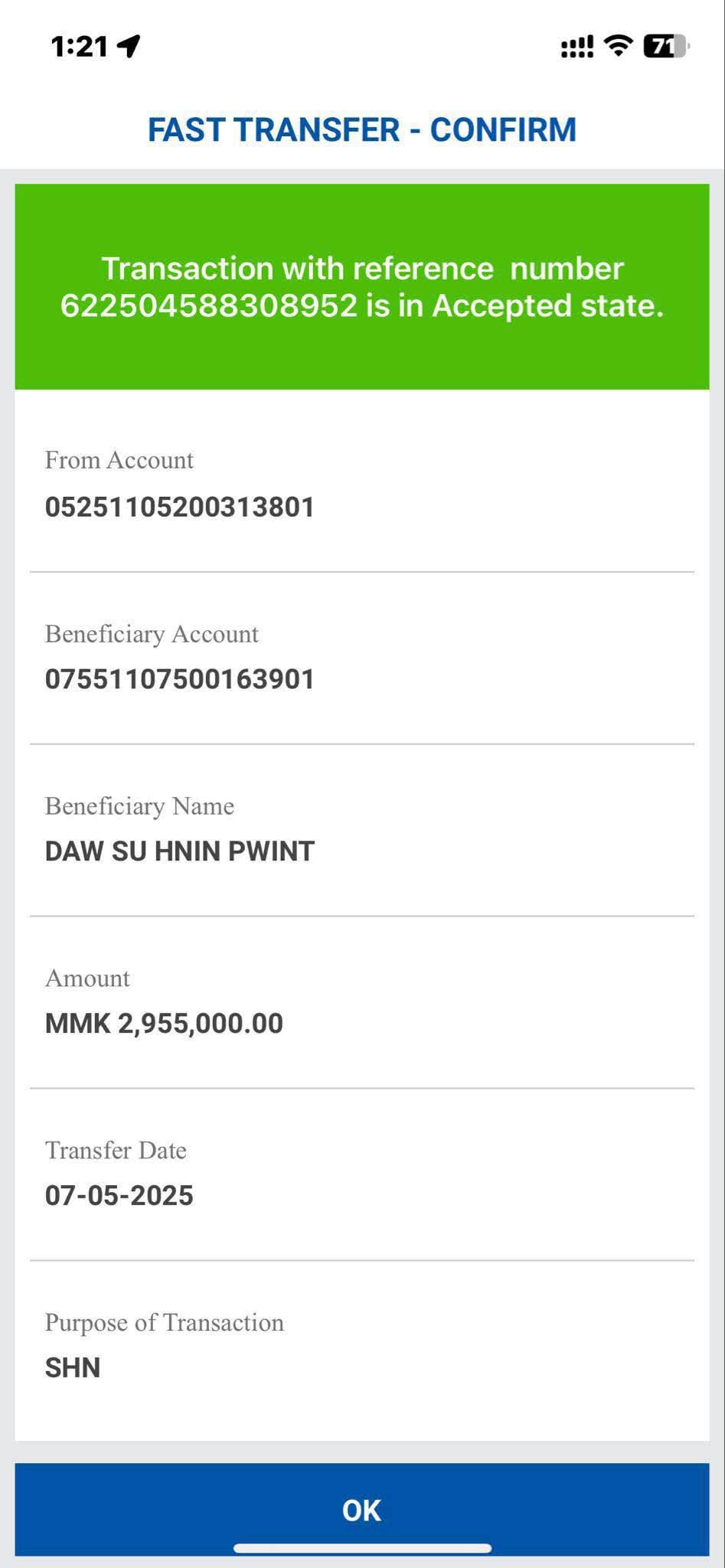 ကျမ မေလ ၇ရက်နေ့က ကုန်သည်ဆီကို အထည်ဖိုး ၂၉သိန်း ၅သောင်း ၅ထောင် (သိန်း ၃၀နီးပါး) လွှဲရမှာကို မခိုင်နှင်းဝေရဲ့ Foundation အကောက်ကို မှားလွှဲခဲ့မိပါတယ်။ကျမ တို့ဘက်က မှားလွှဲမိမိချင်း တစ်နာရီအတွင်း လူကိုယ်တိုင်ရုံးကိုသွားပြောခဲ့ပါတယ်။ရုံးဘက်က မခိုင်နှင်းဝေ ပျော်ဘွယ်ရောက်နေလို့ နောက် ၄ ၅ ရက်နေမှ ပြန်ရောက်မယ် အဲ့ဒီခါကျမှလာခဲ့လို့ပြောပါတယ်။သူတို့ချိန်းတဲ့ ရက်ပြန်သွားတော့ ဘဏ်နံပါတ် ၊မှတ်ပုံတင် အရှေ့နောက်၊ဘဏ် statement တွေသွားယူခိုင်းလို့ ယူပေးခဲ့ရပါတယ် ။အဲချိန်ထိလည်း ရုံးဝန်ထမ်း နဲ့ပဲတွေ့ခဲ့ရတာပါ။ ရုံးဝန်ထမ်းတွေရဲ့ ဆတ်ဆံရေးကလည်း ကျမတို့လှူဖို့သွားတဲ့ အချိန်ဆက်ဆံရေးနဲ့ ငွေမှားလွှဲလို့ ပြန်တောင်းတဲ့ချိန်ဆက်ဆံရေးက ကွာခြားမှုများပါတယ်။ကျမတို့မှာ သူများပိုက်ဆံကို အလကားသွားတောင်းနေရသလို သိမ်ငယ်မှုကိုခံစားခဲ့ရပါတယ်။အဲ့နေ့မှာ သူတို့တောင်းတာ ပေးပြီး သူတို့အဆင့်ဆင့်တင်ရမှာမလို့ နောက်ထပ် ၄ ၅ ရက်ထပ်စောင့်ခိုင်းပါတယ်။