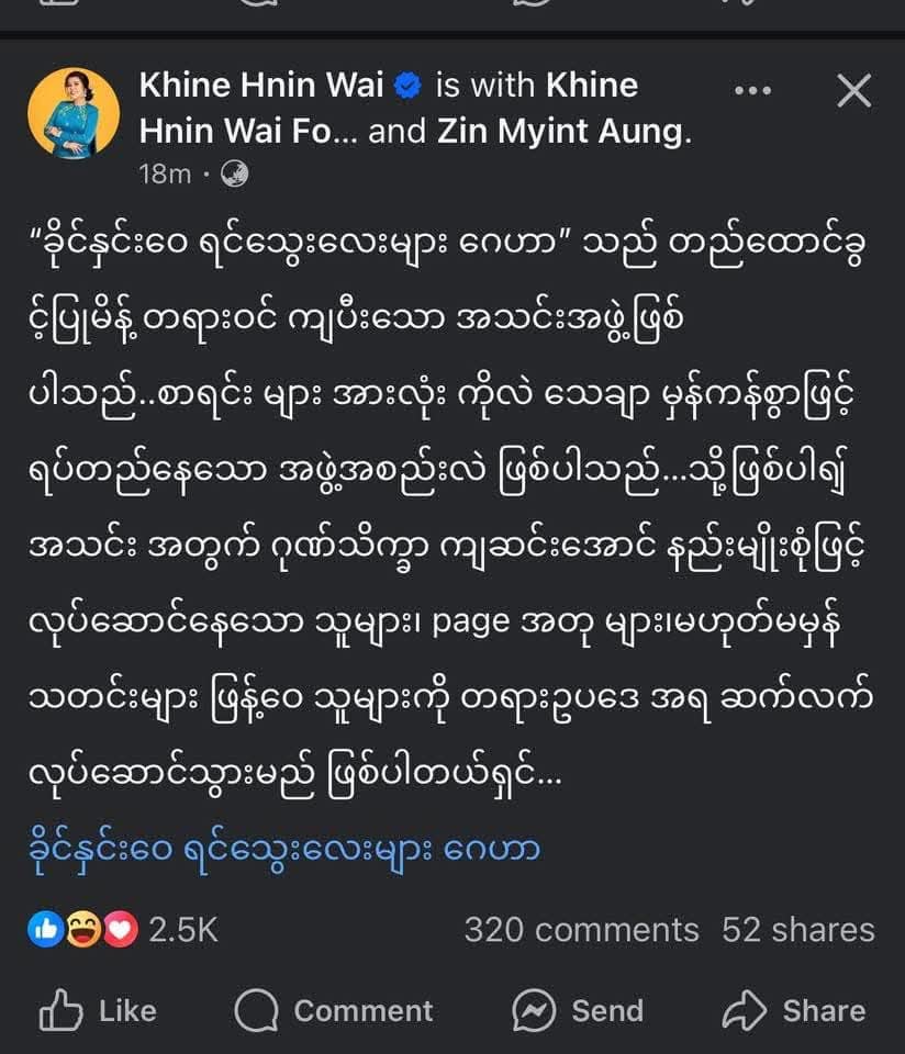 မခိုင်နှင်းဝေရဲ့နာမည်ဂုဏ်သိက္ခာ ကိုလည့်ထိခိုက်စေလိုစိတ်မရှိပါဘူးရှင့် ကျမရဲ့ချွေးနည်းစာလေးကိုပြန်လိုချင်လို့ မေတ္တာရပ်ခံတာပါရှင့်