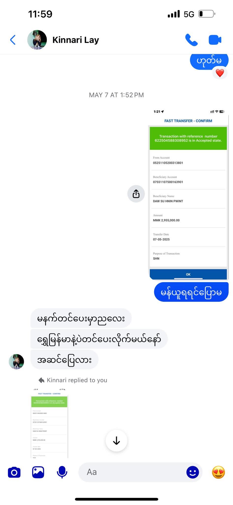 ညမရဲ့ ပိုက်ဆံ ၂၉ သိန်း ၅ သောင်း ၅ ထောင်ကို ညမ ပြန်တောင်းနေရတာ ရှက်လာလို့ဖြစ်ပါတယ်။