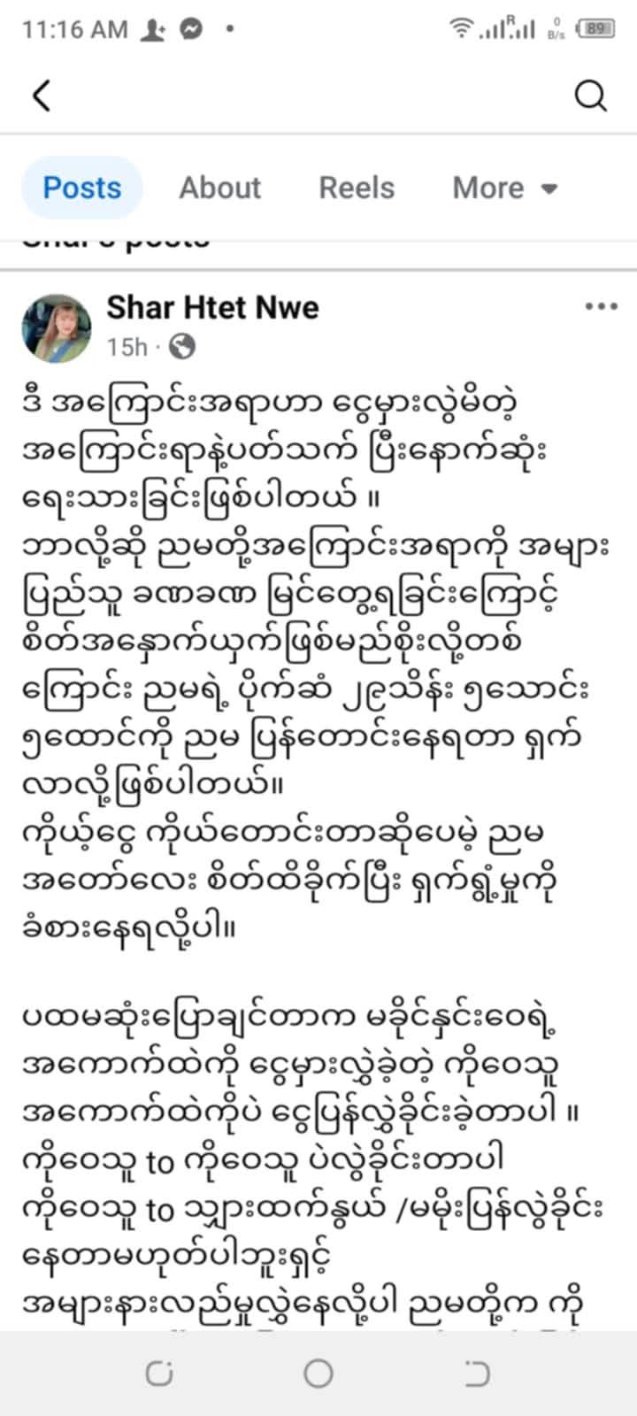 ယခု ပြန်ပေးမယ်ဆိုတဲ့ ပို့စ် တင်ခဲ့ရာမှာလည်း အကောင့်ထဲ ငွေလွှဲထည့်လိုက်လျှင်ပြီးနေသည့်ကိစ္စ မြဝတီရှိ ကမ္ဘောဇဘဏ်ကို ထပ်လာခိုင်းနေတဲ့အတွက် ငွေမှားယွင်းလွှဲမိတယ်ဆိုတဲ့ ကာယကံရှင်တွေအနေနဲ့ စစ်ကောင်စီနဲ့အနီးကပ်ရှိနေတဲ့ ခိုင်နှင်းဝေနဲ့ပတ်သက်ပြီး ပိုမိုဂရုစိုက်ဖို့၊ လုံခြုံရေးအထူးသတိပြုဖို့ ပြည်သူတွေက စိုးရိမ်တကြီး မှာကြားနေတာကိုလည်း တွေ့မြင်ရမှာဖြစ်ပါတယ်။