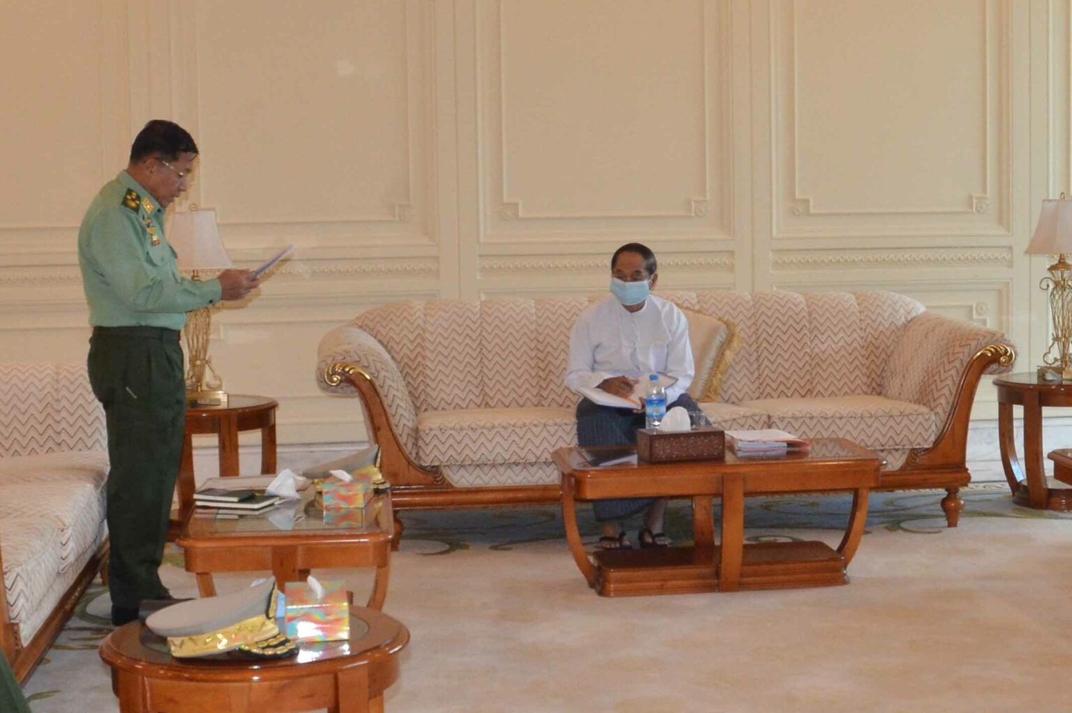 ထို့နောက် ဦးမြင့်ဆွေကို ယာယီသမ္မတ ရာထူးမှ အနားပေးကာ စစ်ခေါင်းဆောင် မင်းအောင်လှိုင် က သူ့ကိုယ်သူ ယာယီသမ္မတအဖြစ် ခန့်အပ်ခဲ့ခြင်းဖြစ်သည်။